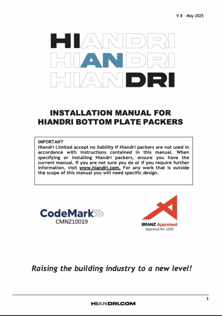 The HIANDRI system has been fully engineered to satisfy the requirements of NZS 3604:2011, NZS 1170:2002, NZS AS 1720.1:2022 their amendments and the Building Code. More importantly HIANDRI packers have CodeMark Certification and are BRANZ appraised. Submitting the CodeMark Certificate and Installation Instructions to the Building Consent Authority (BCA) is an acceptable solution.