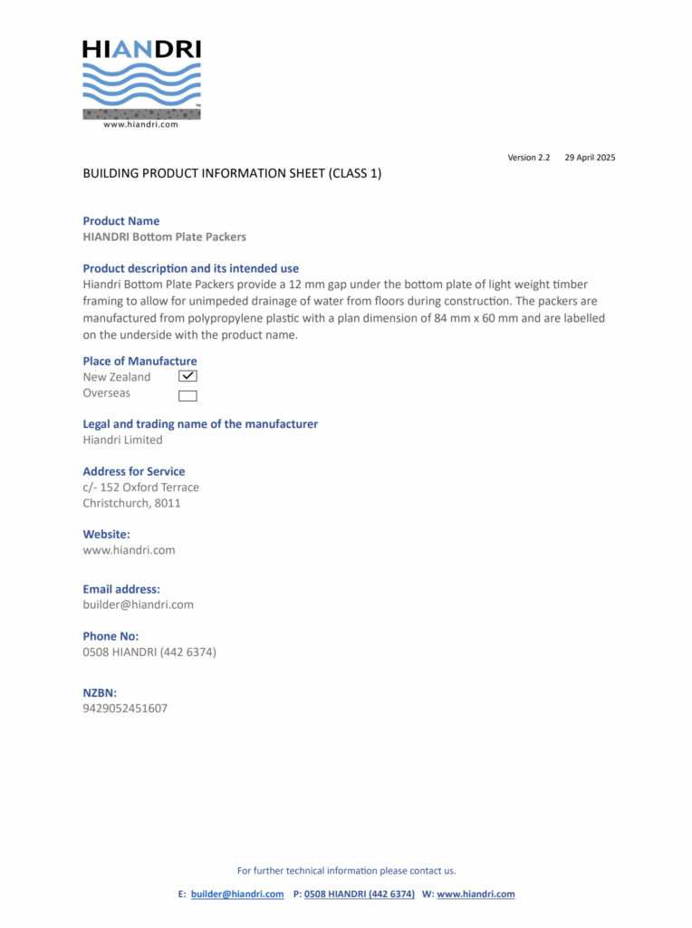 The HIANDRI system has been fully engineered to satisfy the requirements of NZS 3604:2011, NZS 1170:2002, NZS AS 1720.1:2022 their amendments and the Building Code. More importantly HIANDRI packers have CodeMark Certification and are BRANZ appraised. Submitting the CodeMark Certificate and Installation Instructions to the Building Consent Authority (BCA) is an acceptable solution.